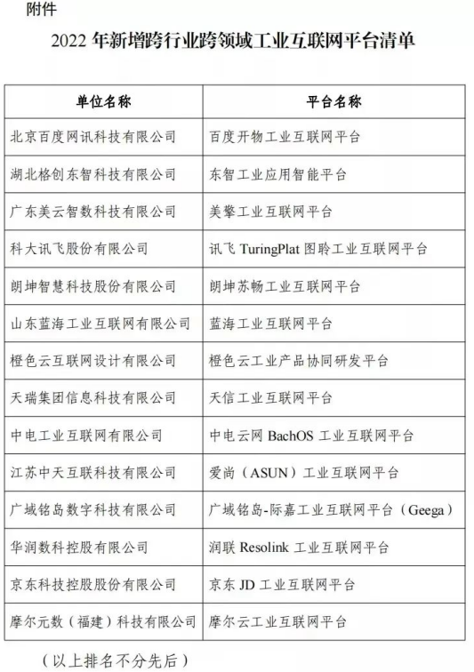 5月5日,工信部公布《2022年新增跨行业跨领域工业互联网平台清单公示》,公告显示,2022年共新增14家跨行业跨领域工业互联网平台。据了解,此次公示的全部是新入围的企业,往年工信部发布的“跨行业跨领域工业互联网平台清单”则未在清单中显示,这是自2019年双跨遴选工作开展以来,新增数量最多的一次。
